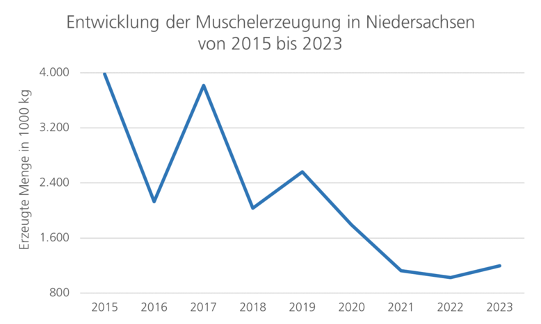 Neben Fisch hat die Produktion von Weichtieren insbesondere Muscheln in Niedersachsen eine wichtige Rolle. Diese nahm im Jahr 2023 erstmalig seit 2019 wieder zu und steigerte sich zum Vorjahr (1.027 Tonnen) um 16,6% (1.197 Tonnen). Obwohl die Zucht von Muscheln stets von „guten“ und „schlechten“ Jahren geprägt ist, ist der allgemeine Abwärtstrend alarmierend. Als Gründe können verschiedene Aspekte eine Rolle spielen. Zum einen schränkte besonders in den vergangenen Jahren die Covid19-Pandemie die Arbeit der Betriebe ein, zum anderen beeinträchtigen Bautätigkeiten im Meer wie Kabelverlegung, Hafenausbau und aktuell auch LNG-Terminals und neue Offshore-Windparks immer wieder die Muschelbänke. Hinzu kommen Belastungen des Ökosystems durch den Klimawandel. Vermehrte Extremwetterereignisse wie Stürme und erhöhte Wassertemperaturen können beispielsweise die Muschelsaat beeinträchtigen. Weiterhin bedrängen invasive Arten wie die pazifische Auster, die vom Menschen zur Züchtung ausgebracht wurde und sich seit Jahrzehnten im Wattenmeer ausbreitet, die heimischen Muscheln.