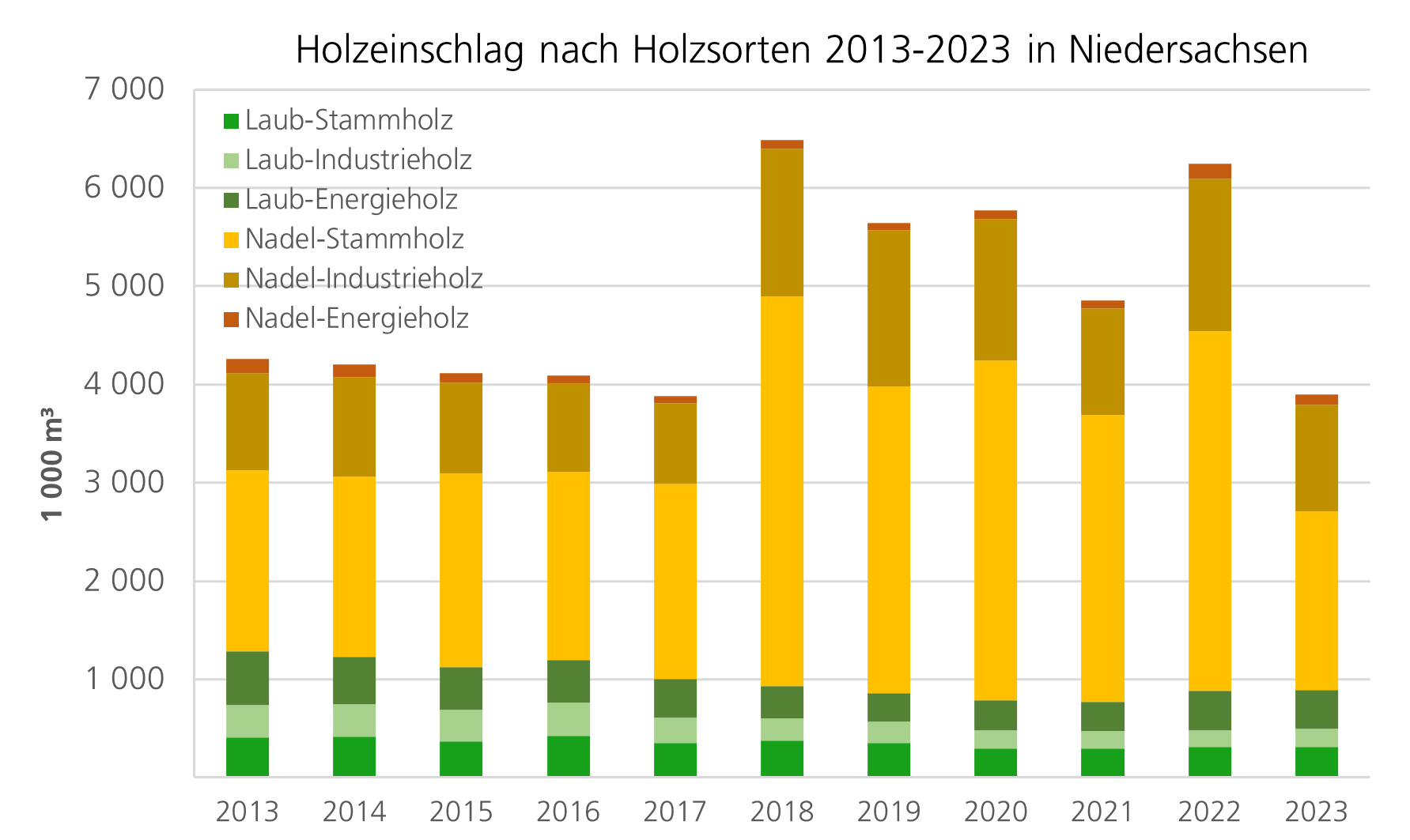 Etwa 75,0% des durch Schäden verursachten Holzeinschlags entfielen in Niedersachsen auf die Nadelhölzer (606.000 m³). Seit 2017 leidet vor allem der Fichtenbestand unter den insektenbedingten Kalamitäten und zunehmendem Trockenstress. Die anderen 25,0% des gesamten Schadholzeinschlags waren hauptsächlich durch Trockenheit geschädigte Laubhölzer (125.000 m³). Aber auch Schädlinge wie Eichensplintkäfer und Eichenkernkäfer werden zukünftig beim insektenbedingten Einschlag von Eichenholz eine immer bedeutsamere Rolle spielen.