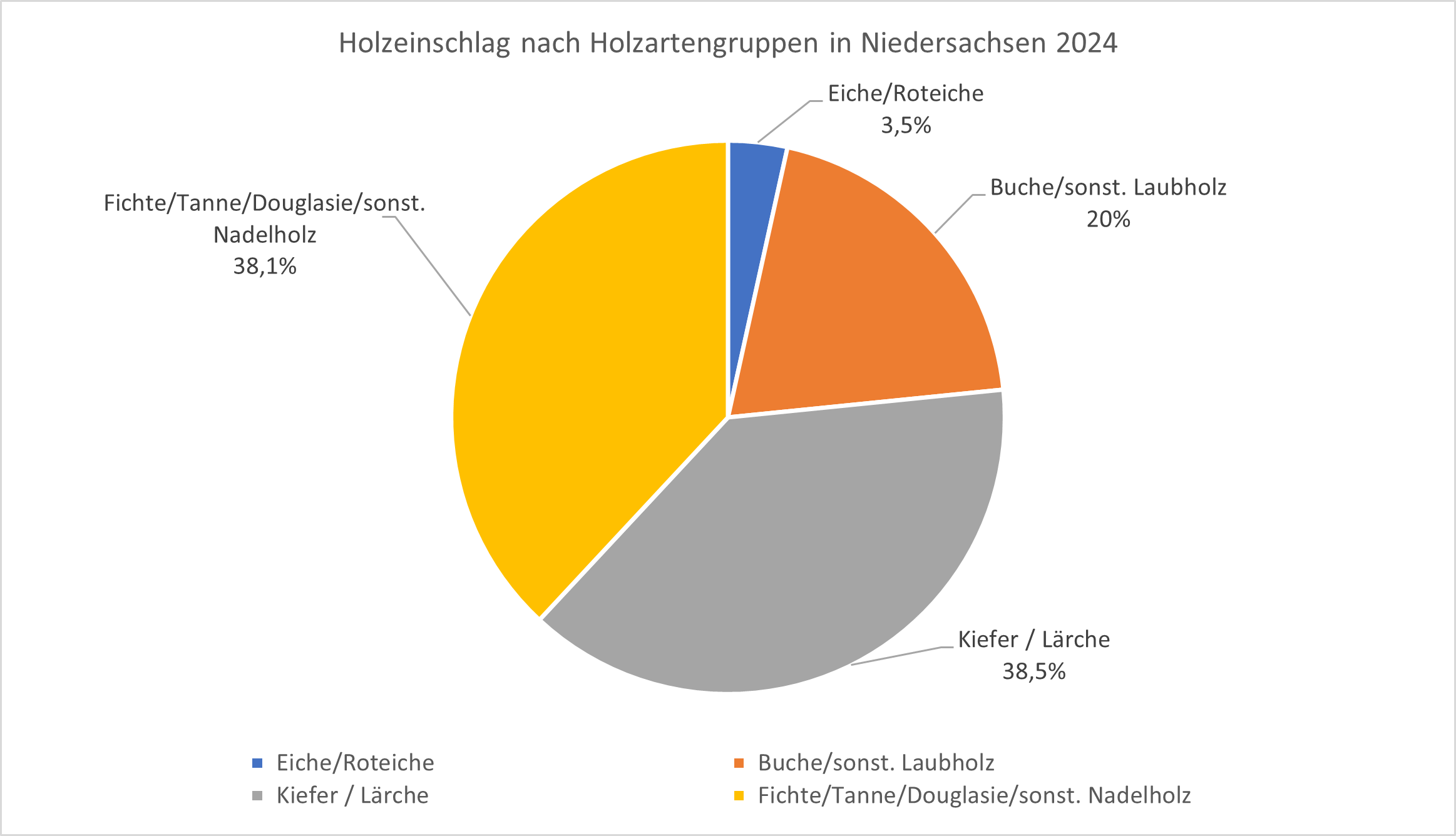 Den Großteil des Gesamtholzeinschlags mit rund 2,6 Millionen Kubikmetern machten 2024 in Niedersachsen die Nadelhölzer aus. Davon waren mit 1,3 Millionen Kubikmetern die Holzarten Fichte, Tanne, Douglasie und sonstiges Nadelholz repräsentiert. Von den Holzarten Kiefer und Lärche wurden dementsprechend ebenfalls 1,3 Millionen Kubikmeter eingeschlagen.