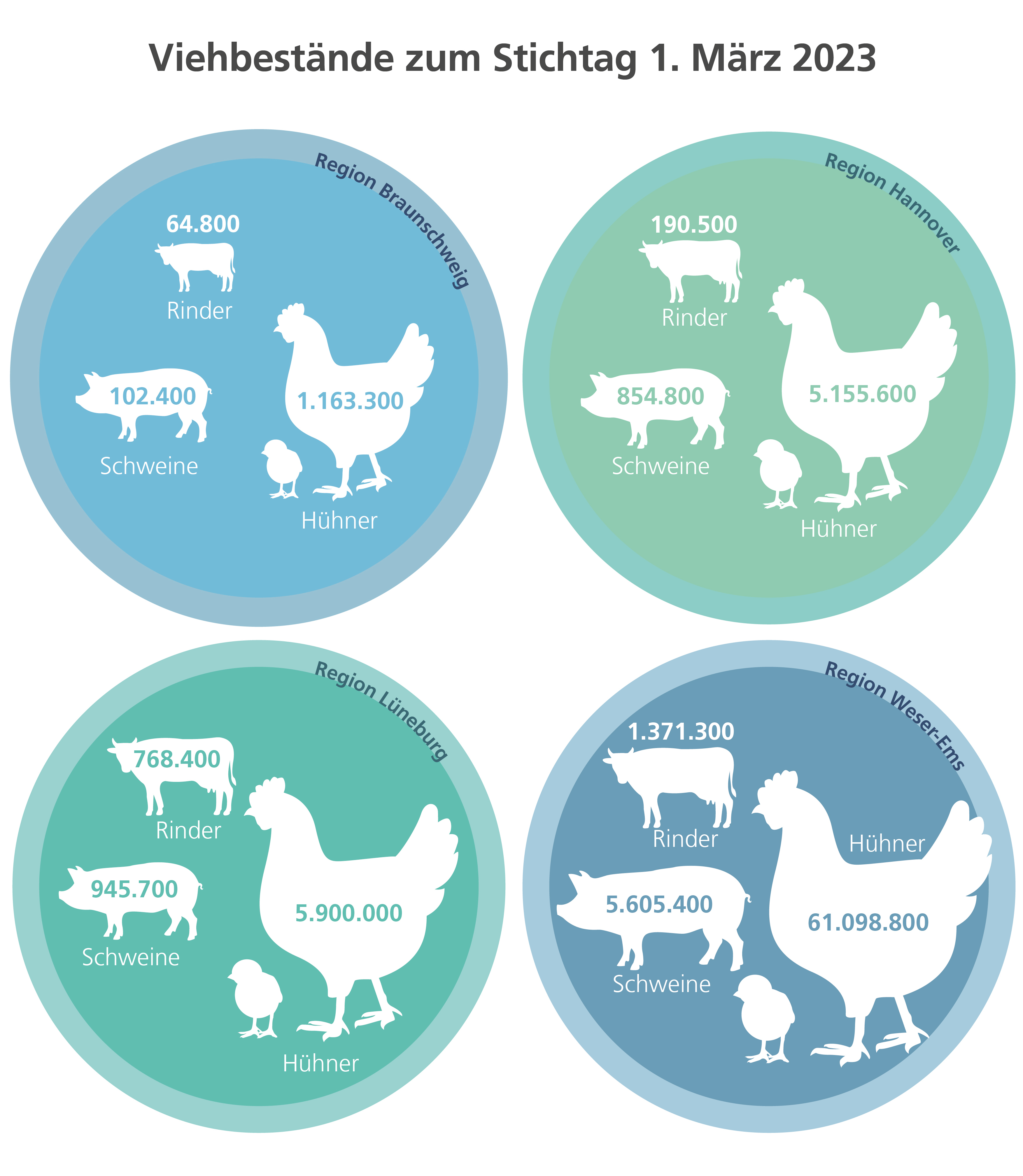 Insgesamt zeigt sich für den niedersächsischen Tierbestand jedoch, dass die Hühner mit ca. 73 Mio. Tieren zum Stichtag 03. März 2023 in Niedersachsen deutlich in der Überzahl waren. Mit großem Abstand folgten auf Platz 2 die Schweine und einem Bestand von ca. 7,5 Mio. Tieren. Platz 3 belegten Rinder mit einer Anzahl von 2,4 Mio.