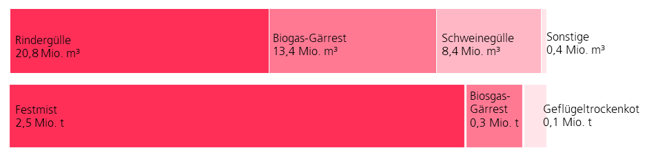 Rund 69 % des flüssigen Wirtschaftsdüngers wurde auf dem Ackerland ausgebracht und mit den restlichen 31 % wurde das Dauergrünland gedüngt. Fester Wirtschaftsdünger hingegen wurde nur zu 18% auf Dauergrünland ausgebracht, 82% wurden auf Ackerland genutzt.