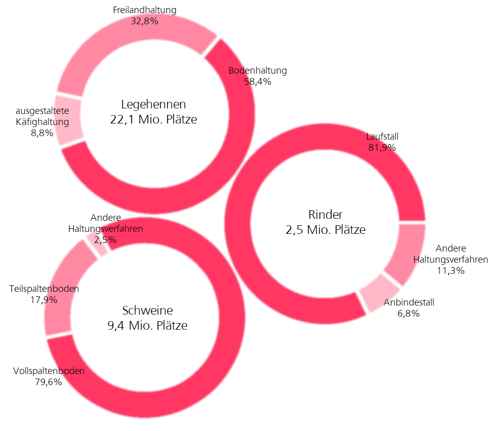 Während bei Legehennen deutlich auf Freilandhaltung gesetzt wird (32,8%), ist Auslauf bei Schweinen wenig repräsentiert. Rund 0,6% aller Haltungsplätze für Schweine bieten einen Zugang zu Auslauf. Bei der Rinderhaltung ist das Weiden hingegen eine gängige Haltungsform in Niedersachsen.