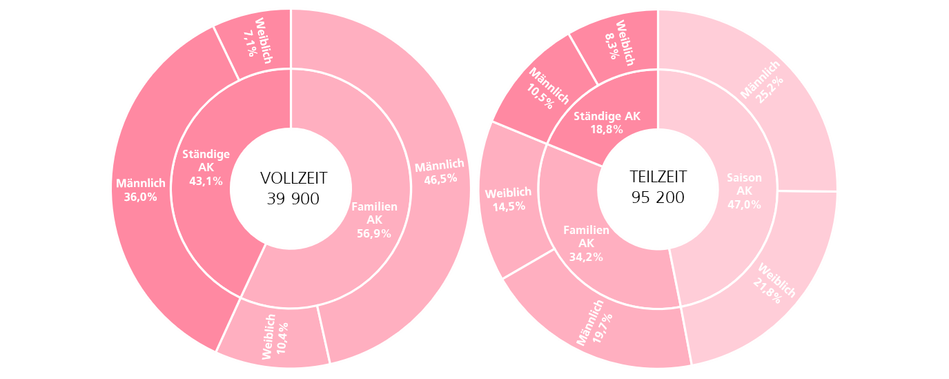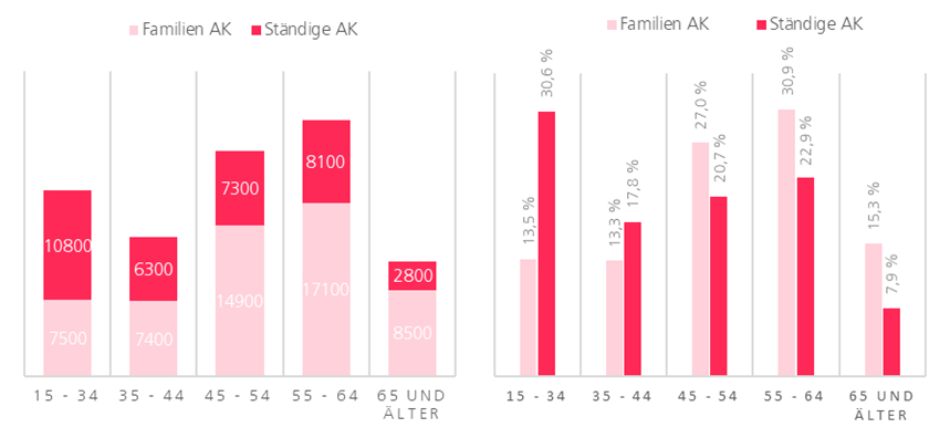 Den größten Anteil an Arbeitskräften machte zum Stichtag 01. März 2020 die Altersgruppe der 55 bis 64-Jährigen aus (25 200 Personen). Auch der größte Anteil Familien AK (17 100 Personen) befand sich in dieser Gruppe. Der Anteil an ständigen AK (10 800) hingegen war in der Gruppe der unter 35-jährigen Personen am größten.