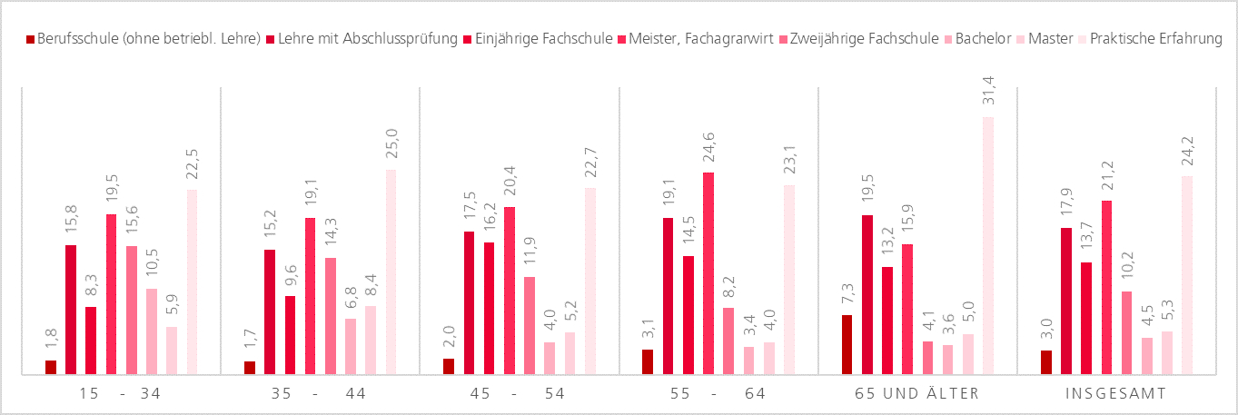 Knapp ein Viertel aller Betriebsleiterinnen und Betriebsleiter führten den Betrieb mit ausschließlich praktischer Erfahrung in der Landwirtschaft. Nicht auszuschließen ist in diesem Fall eine Ausbildung im nicht-landwirtschaftlichen Bereich z. B. in Betriebswirtschaftslehre. Der Besuch einer sogenannten Landwirtschaftsschule ohne betriebliche Ausbildung sank in den letzten Generationen stetig. Ein Grund hierfür sind bessere Ausbildungsmöglichkeiten und geringerer Druck, den heimischen Betrieb möglichst schnell zu übernehmen. Fast die Hälfte aller Betriebsleitungen besaß im Jahr 2020 einen höheren Abschluss wie Meister/-in, zweijährige Fachschule, Bachelor oder Master beziehungsweise ein Diplom. Da man eine höhere Ausbildung erst nach einer gewissen Zeit erreicht, sind bei jüngeren Betriebsleitungen Masterabschlüsse oft noch nicht vertreten, dennoch zeigt sich ein Trend hin zum Studium im agrarwissenschaftlichen und agrarwirtschaftlichen Bereich.