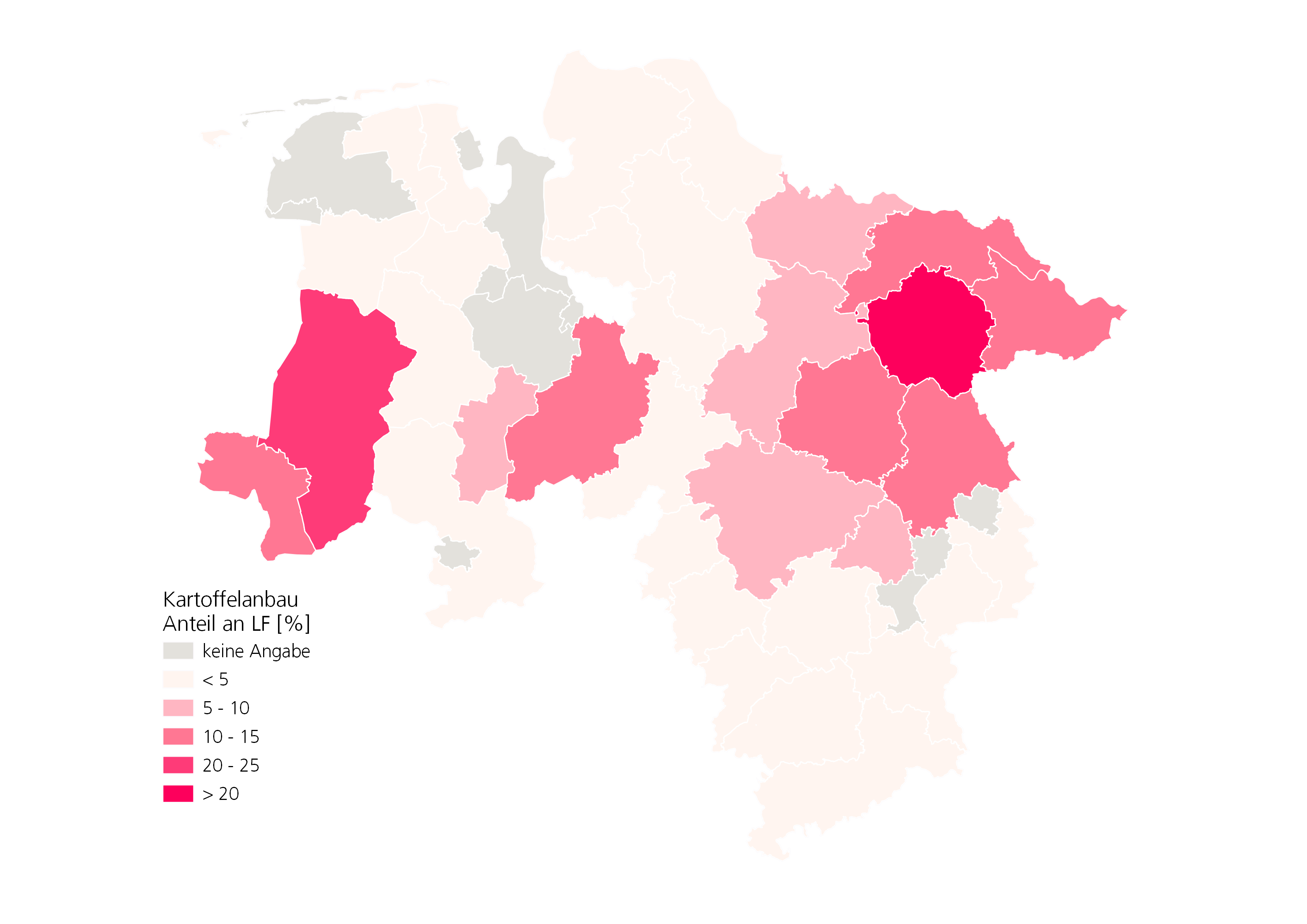 Der Kartoffelanbau war auch im Jahr 2020 stark regionalisiert. So stachen Landkreise wie Uelzen mit etwas mehr als 20 % Anteil Kartoffelflächen am Ackerland heraus. Insgesamt ist die Statistische Region Lüneburg mit ihren sandigen Böden Speisekartoffelregion. Im Kreis Emsland wurden meist Industriekartoffeln angebaut. Dort machte der Kartoffelanbau im Jahr 2020 rund 16,5 % der Ackerfläche aus.