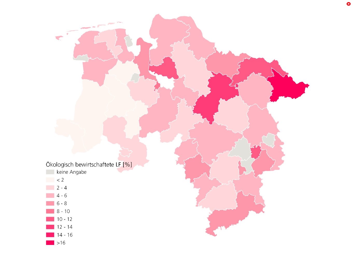 Die meisten ökologisch bewirtschafteten Flächen befanden sich 2020 im Kreis Lüchow-Dannenberg – sie machten dort einen Anteil von 17,0 Prozent aus. Es folgten der Heidekreis mit 13,1 Prozent und Lüneburg mit 11,8 Prozent.