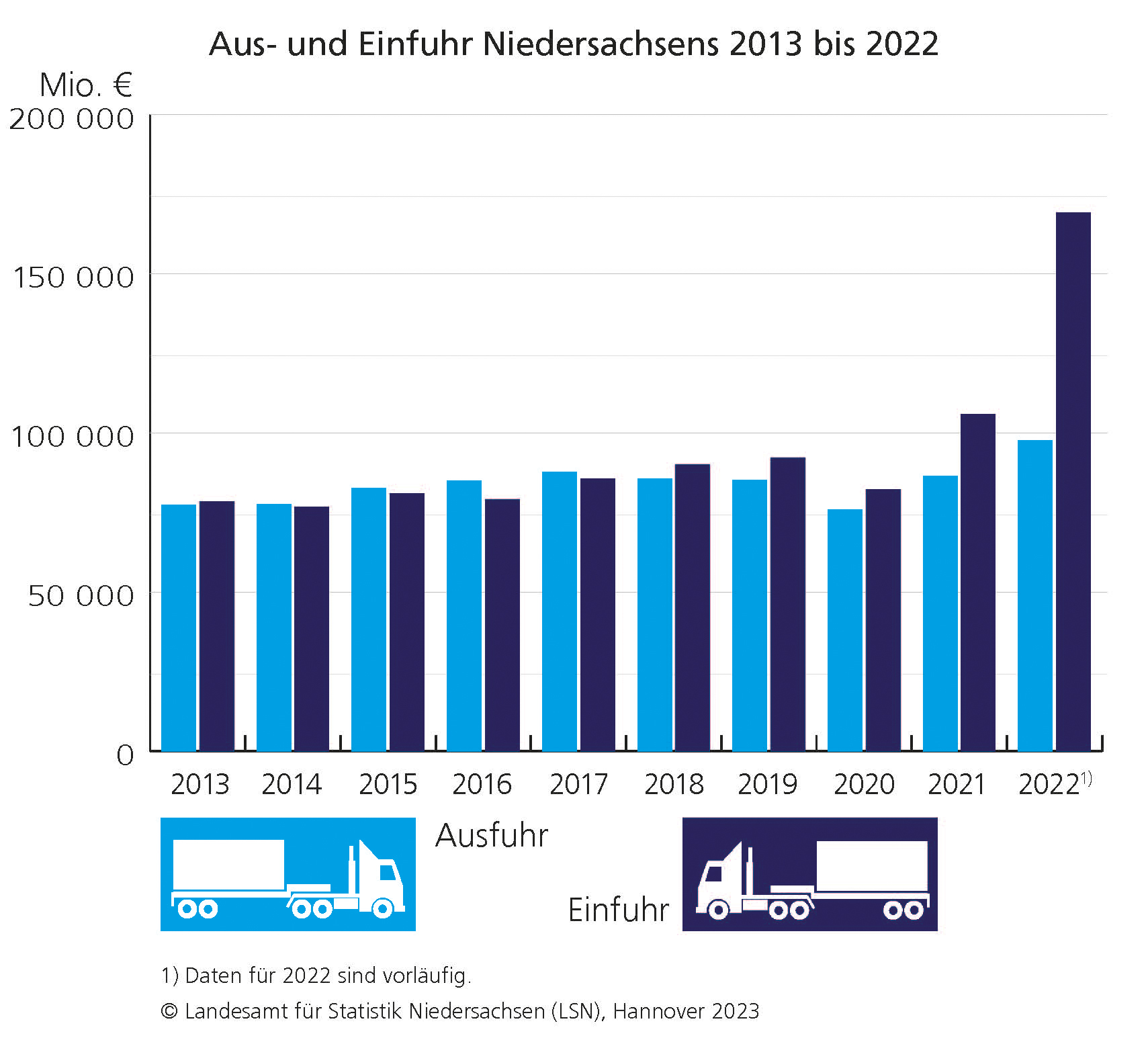 Was sind die wichtigsten Exportgüter Niedersachsens? Welche Länder sind die bedeutendsten Handelspartner? Wie viele Fahrzeuge exportiert Niedersachsen und wie viele Nahrungsmittel werden importiert? Antworten dazu liefern die Ergebnisse der Außenhandelsstatistik. Der Außenhandel bildet den grenzüberschreitenden Warenverkehr ab. Dabei geht es einerseits um den Export, also die Ausfuhr und andererseits um den Import, die Einfuhr von Gütern. Hierbei werden sämtliche physisch exportierten und importierten Waren erfasst – inklusive elektrischem Strom und Erdgas. Als Handelsbilanz oder Außenhandelssaldo bezeichnet man dabei die Differenz zwischen den Exporten und den Importen.