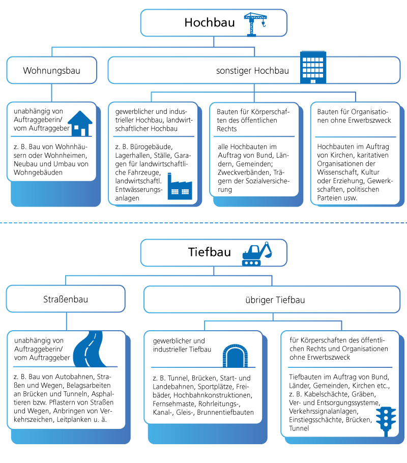 Nach der Klassifikation der Wirtschaftszweige von 2008 (WZ 2008) unterteilt sich das Baugewerbe in die beiden Teilbereiche Bauhaupt- und Ausbaugewerbe.