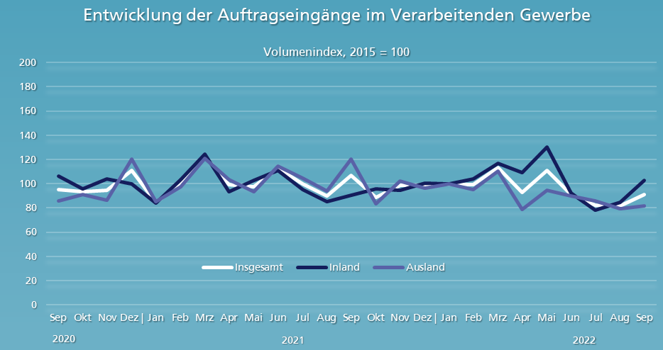 In ausgewählten Branchen des Verarbeitenden Gewerbes in Niedersachsen werden die Auftragseingänge monatlich erhoben, um die aktuelle Nachfrage nach Industrieprodukten darzustellen und die Konjunktur einschätzen zu können. Die Auftragseingänge umfassen den Wert aller im jeweiligen Berichtsmonat fest akzeptierten Aufträge auf Lieferung selbst hergestellter oder in Lohnarbeit gefertigter Erzeugnisse ohne Umsatzsteuer. Dabei wird beim Auftragseingang zwischen In- und Auslandsnachfrage unterschieden. Aus dem Auftragseingang werden Indizes berechnet, welche die monatliche Entwicklung der Auftragseingänge im Vergleich zu anderen Zeiträumen messen. Um Preiseffekte, zum Beispiel durch die Inflation, auszublenden und die reale Nachfrageentwicklung abbilden zu können, werden die ermittelten Wertindizes des Auftragseingangs mithilfe der Erzeugerpreisstatistik sowie der Ausfuhrpreisstatistik preisbereinigt und ergeben dann den entsprechenden Volumenindex.