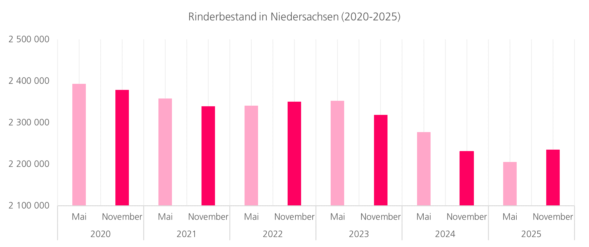 Der klare Trend in der Rinderhaltung hin zur Abnahme der Bestände blieb trotz eines leichten Zuwachses im November 2022 und Mai 2023 deutlich erkennbar. So nahm in Niedersachsen die Anzahl gehaltener Rinder in den vergangenen Jahren ab. Auch die Anzahl der Betriebe verringerte sich von 19 940 im Mai 2019 auf 18 116 im November 2024 (-9,1%). Die durchschnittliche Anzahl von Tieren pro Betrieb blieb in den vergangenen sechs Jahren konstant bei rund 123/124 Tieren.