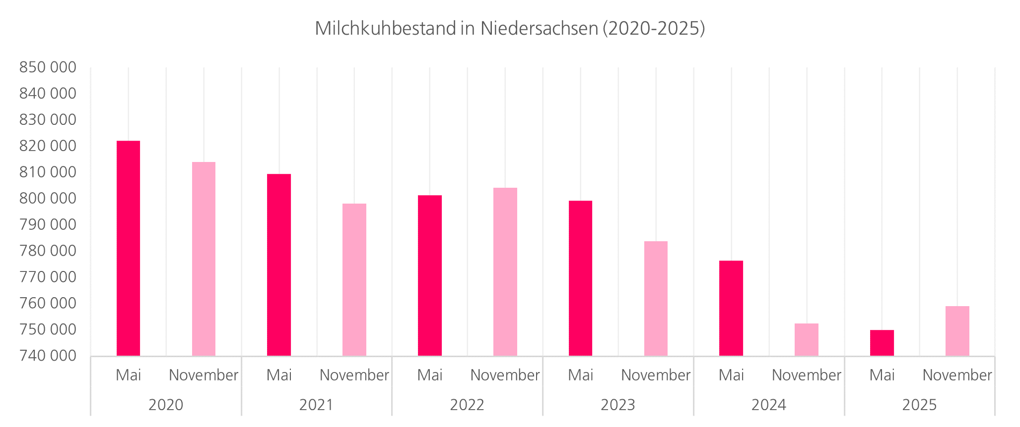 Von den 2,23 Mio. Rindern waren rund 752 508 Milchkühe (Stand: November 2024). In den letzten sechs Jahren nahm die Anzahl der Milchkühe um 10,8% ab. Von 9 015 Betrieben im Mai 2019 hatten sechs Jahre später noch 7 248 Betriebe (-19,6%) Milchkuhhaltung. Pro Betrieb wurden im November 2024 rund 104 Milchkühe gehalten. Das waren rund 11 Tiere mehr als noch im Jahr 2019.