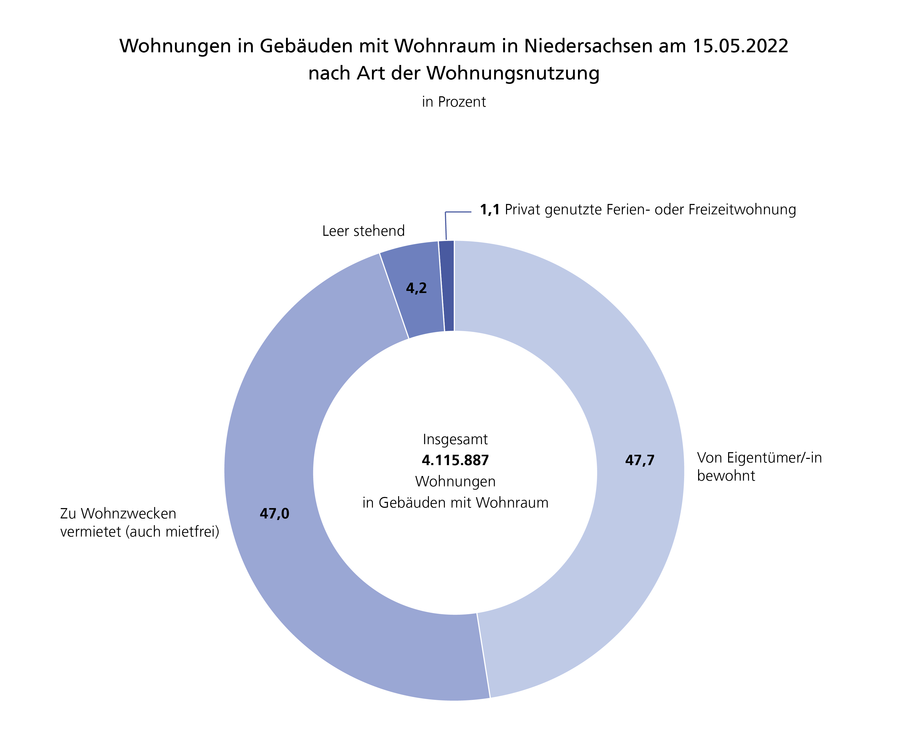 In Niedersachsen gab es zum Zensusstichtag mehr als 4,1 Mio. Wohnungen in Gebäuden mit Wohnraum. Die meisten Wohnungen wurden entweder selbst bewohnt (47,7%) oder zu Wohnzwecken vermietet (47,0%).