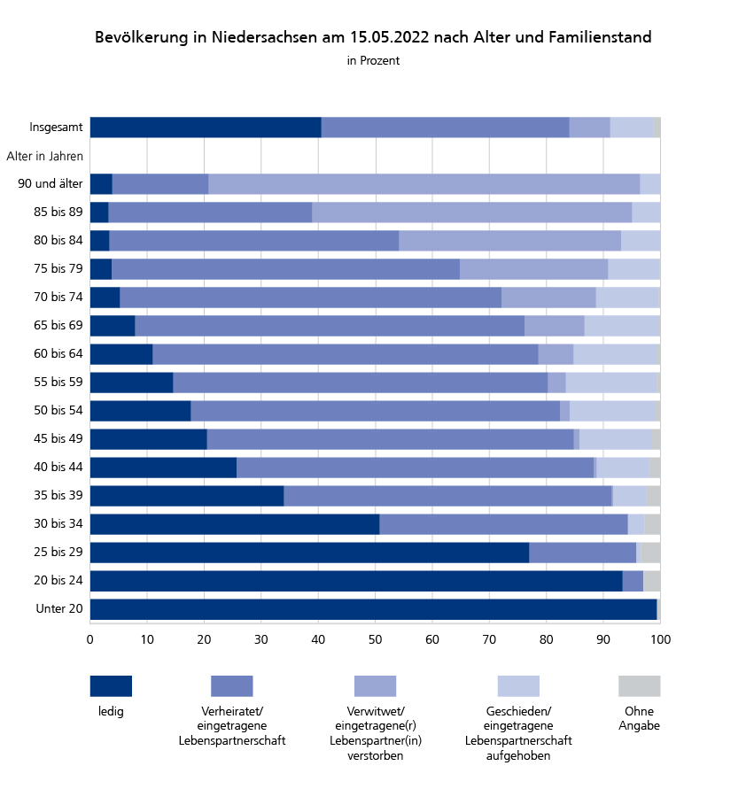 In Niedersachsen waren im Mai 2022 28,7% der volljährigen Bevölkerung ledig und 52,3% der Menschen waren verheiratet oder lebten in einer eingetragenen Partnerschaft. Mit zunehmendem Alter sank der Anteil an ledigen Personen. Ab dem Alter von 35 bis 39 Jahren überwogen die verheirateten oder in einer eingetragenen Lebenspartnerschaft lebenden Personen. Hochbetagte Menschen im Alter von 85 Jahren und mehr waren überwiegend verwitwet bzw. die eingetragene Lebenspartnerin oder der eingetragene Lebenspartner war bereits verstorben.